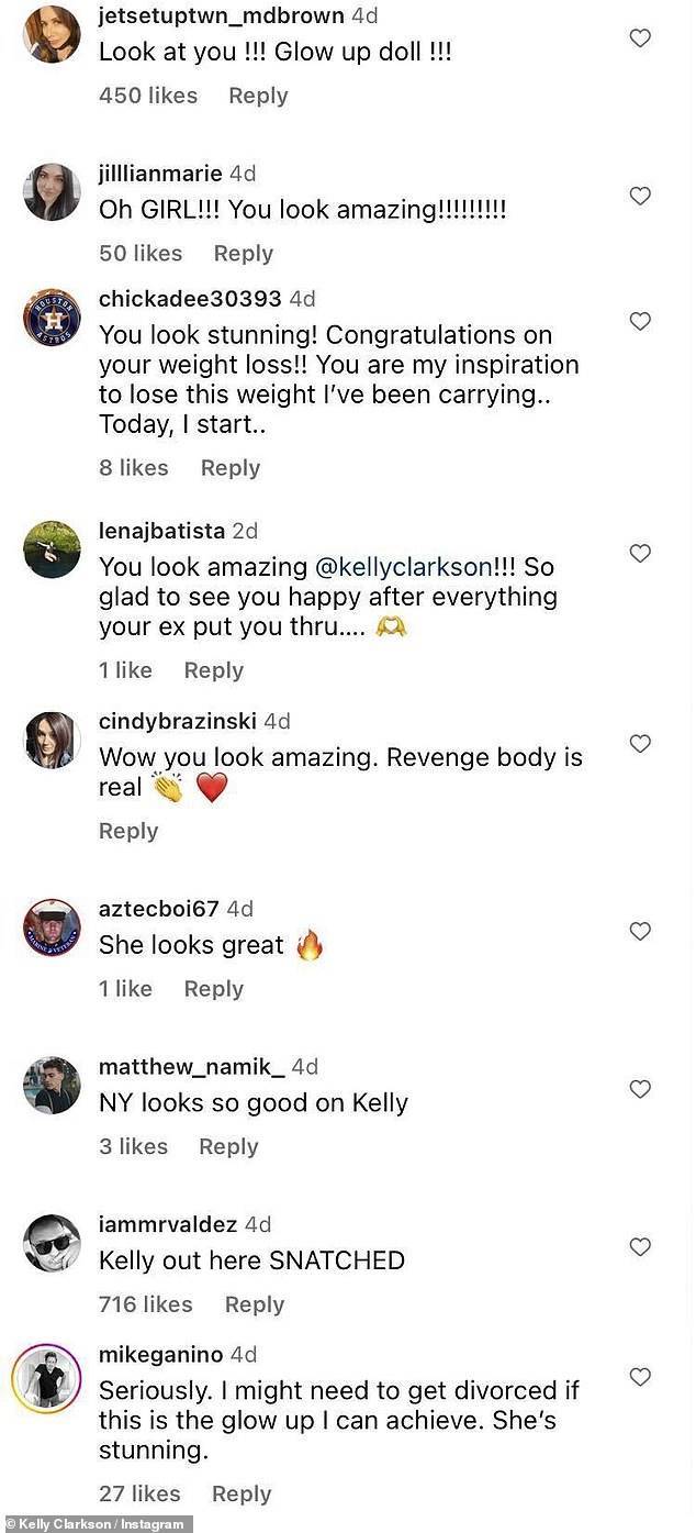 'You look amazing @kellyclarkson!!! So glad to see you happy after everything your ex put you thru...'