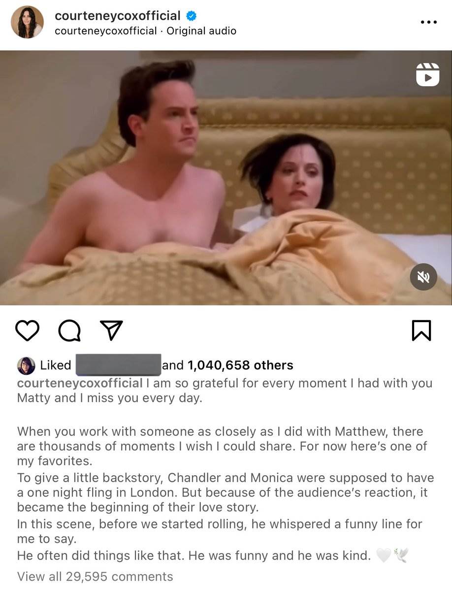 Courteney Cox, known for her role as Monica Geller on the iconic sitcom Friends, recently shared a touching message in honor of her on-screen husband, Matthew Perry. In her heartfelt tribute, Cox expressed her enduring love for their characters, Monica and Chandler, affectionately known as Mondler by fans.