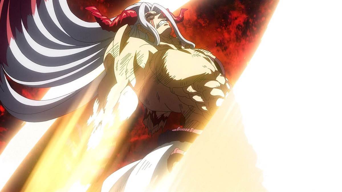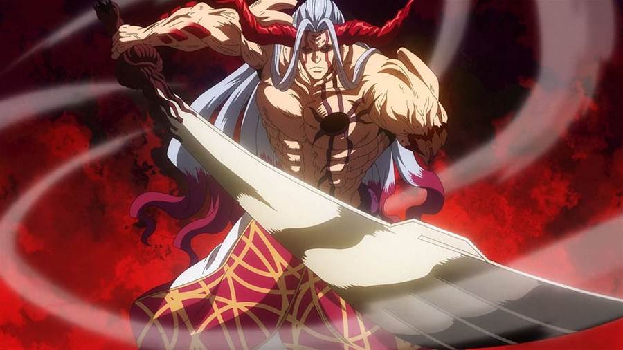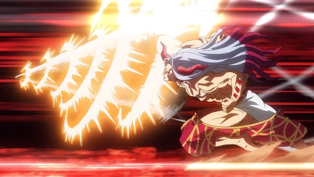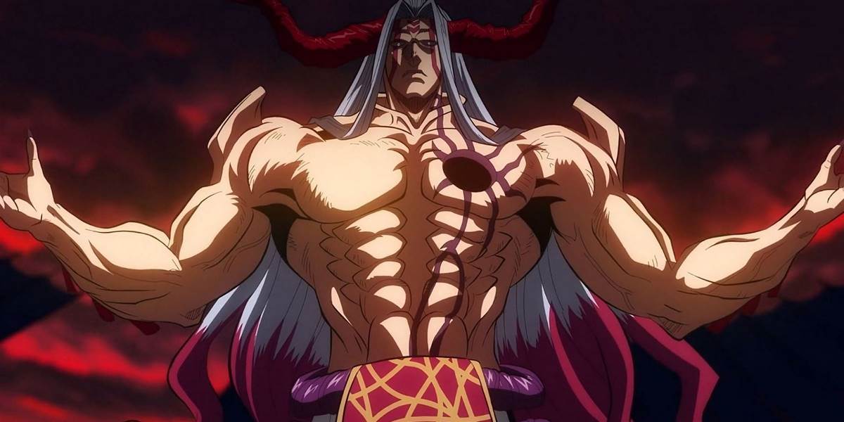 anime series. He is quite tall and has a muscular physique with long lilac-colored hair. He has two massive red-colored horns that are jutting out of his head. He also has spikes and other appendages extending from his forearm and shoulder region.
